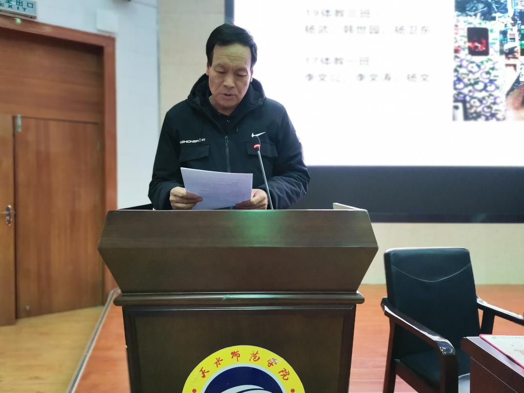 12月21日晚,体育学院在二号报告厅召开考试诚信教育大会暨学生干部聘任大会,学院党政领导班子,各教学系(部)主任,辅导员,19级、20级各班班主任,20级全体学生,以及19级、18级、17级各班学生代表共计370多人参加。大会由学院团委书记王昊支持。