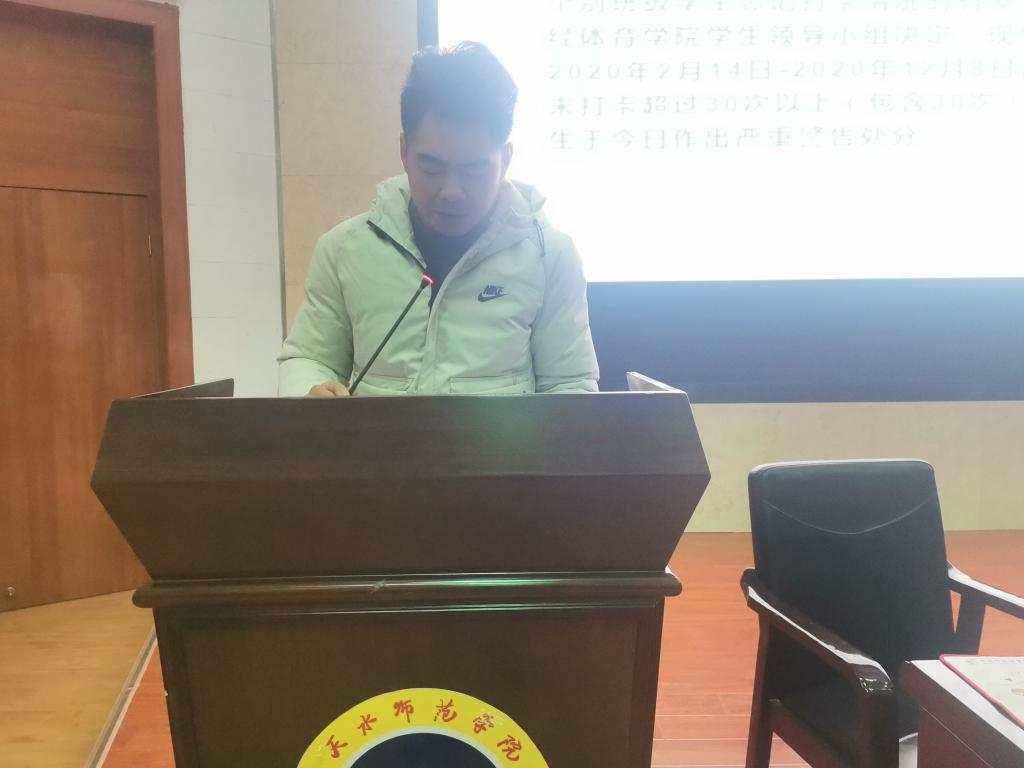 大会伊始,学院副院长苏兴田带领全体与会人员学习了《天水师范学院学生违反考试纪律处分规定》。