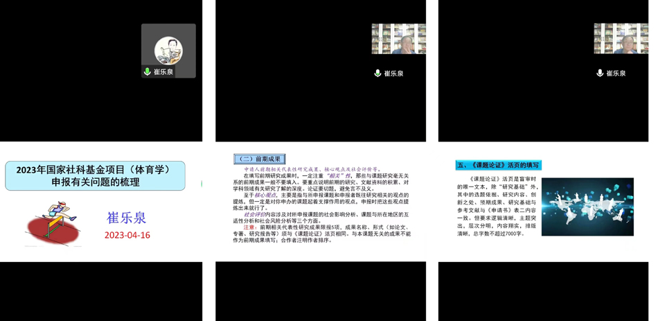 德赢winac米兰以“三抓三促”行动为抓手,积极组织教师申报高级别科研项目,并及时给予指导辅导。4月19日晚,学院邀请中国体育博物馆研究馆员、郑州大学特聘教授崔乐泉在线为教师作2023年国家社科基金项目申报辅导报告。