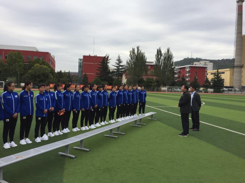 10月11日,副校长、校体委主任安建平为即将参加中华人民共和国第十四届学生运动会足球项目预赛的德赢女子足球队作出征动员讲话。