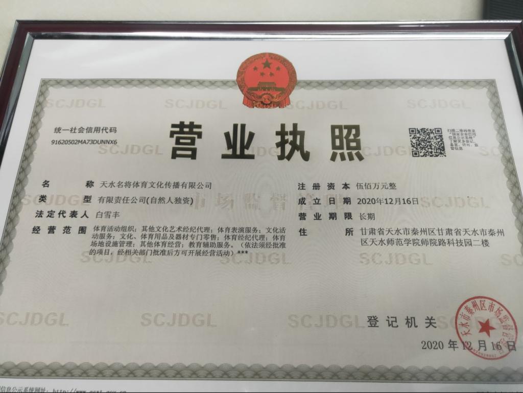 在体育学院的教学改革之中,积极鼓励学生自主创业。由体育教育专业在校学生申请注册的“天水名将体育文化传播公司”于2020年12月正式成立。该公司主要经营范围是体育培训、体育活动组织、体育表演服务、教育辅助服务等。